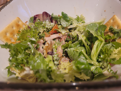 En nuestro caso, de primero, Ensalada "César", entrecomillado, supongo que porque no tiene nada que ver con la ensalada César que todos conocemos: tacos de jamón York en lugar de pollo, galletitas saladas en lugar de pan tostado, y una salsa de sabor indescriptible en lugar de la salsa César.