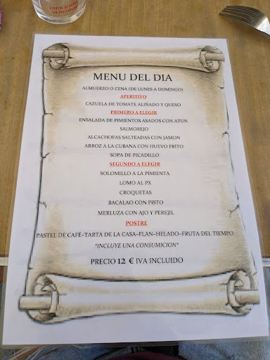 🍽️ Comida: El menú no está mal, pero no todo es lo que parece. Las alcachofas salteadas con jamón son de bote y parecen más bien cocidas. El pisto que acompaña el bacalao también parece de bote. Las croquetas sí parecen caseras.
