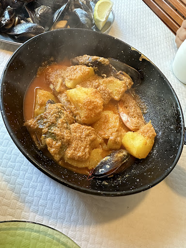 Read moreCame here for lunch on a rainy Friday in late September. We arrived at around 1pm and got the last table available even though nearly all the other restaurants had virtually nobody in them. We were served by a very nice young man, in Spanish, who was serving everybody else, so it took us some time to get served. We chose from the set menu and had a carafe of house white wine while we waited. All the time there were people coming in and being turned away because there were no tables available. We chose peppers stuffed with cod + gambas for starters and then squid (fried in very thin batter) with salad, plus an ice cream cake and coffee, plus we were given a liqueur to finish. The quality and quantity of the food was excellent, tasting lovely and very fresh. The whole meal for 2 came to