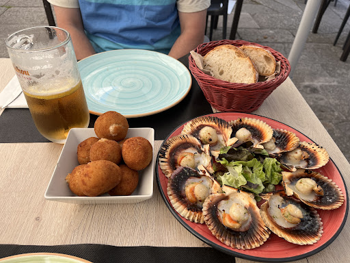 En cuanto a la comida, hemos pedido una mariscada, la peor que me he comido en la vida. Navajas rancias y congeladas como los mejillones (ni los hemos tocado), en cuanto al resto todo muy mediocre y frio. Después de pagar 90 euros por ese plato y en galicia, esperábamos algo mejor. Por cierto, en el menú decía que la mariscada incluía percebes, los sigo esperando. Gambas al ajillo frias y congeladas.