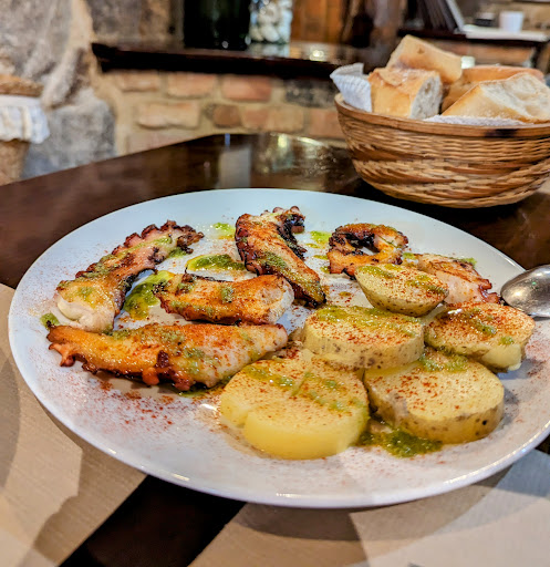 Read morePaseando por Baiona descubrimos esta pequeña taberna escondida en una de las estrechas callejuelas del centro, con muy pocas opiniones pero con una decoración preciosa, eran ya casi las 13:00 y decidimos pasar a comer, estaba todo reservado pero una simpática camarera nos indico que si comíamos ya nos podía buscar una mesa para dos. En cuanto a la calidad de la comida...todo está buenísimo, el pulpo a la brasa en su punto, bien tierno y jugoso, la carne con mucho sabor y poco hecha como habíamos pedido. Quedamos encantados, el precio muy bien para la cantidad y calidad...