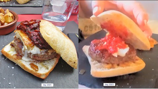 Vaig descobrir aquest bar per casualitat l'any 2018. Vaig quedar sorprès de la generositat de l'hamburguesa i la seva exquisidesa. Mai n'havia menjat cap enlloc com aquella. Ho vaig explicar a tothom; familiars, amics, a coneguts i a desconeguts. Vaig arribar a fer 100 quilòmetres de més expressament per tornar-hi. Hi he portat a la parella, la família, els amics, ... . Sempre els ho he dit als propietaris. A partir de l'any 2020 les hamburgueses i la seva condimentación ja van començar a anar de menys; menys quantitat, menys formatge de cabra, menys ceba i pebrot i menys cuit, ... . Aquest any 2023 ja no tenen res a veure amb les de quan vaig descobrir el lloc. La carn no és ni de bon tros com la d'abans, menys quantitat, poc formatge, molt poca ceba i pebrot i a més tot cru. Tinc fotos que ho demostren. I a més, si hi vas a mig matí, a esmorzar, et diuen que no et poden fer res calent perquè el cuiner no hi va fins la una. Em vaig quedar de pedra. A tothom qui li vaig recomanar el lloc li faré saber i li ensenyaré les meves fotos perquè ara ja és un bar de batalla. No crec...