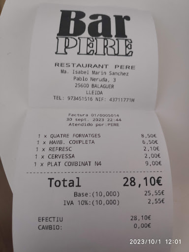 Read moreVolia fer una foto per penjar-la aquí pro la veritat ja hi són totes, moltes coses molt importants el Pere es professional desde que tinc memoria, annar a casa seva sigui a fer un veure un bocata, un esmorzar de forquilla i ganivet, unes tapes i o dinar i sopar es acertar segur fan les coses amb carinyo i professionalitat i tan o més important que també es una garantia amb una riatlla a...
