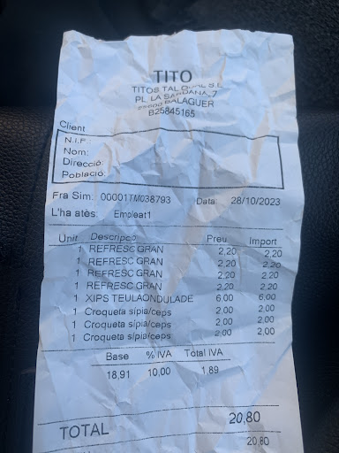 Read moreNo disponen de carta , las tapas son una aventura, igual que los precios. Abusivos, una croqueta 2€…. Si en la carta figura el precio no se piden ni en broma… las” bravas” son cuatro patatas congeladas onduladas y cubiertas de sal… acompañadas por de salsa de queso y salsa barcacoa…6€ la ración!!! Exageradamente caro para el servicio y la calidad. Normal que esté vacío un sábado...