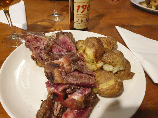 Read moreLa verdad es que no tuve una grata impresión, el local esta bien, y tiene un ambiente agradable gracias a la chimenea, pero una vez sentados, se notaba un poco de frio. El menú, escueto, pero a priori bueno, pedimos osobuco, chuleta de vaca vieja y tosta de jamón. El osobuco bien, sin queja, pero tengo que decir que la chuleta, que podéis ver en las fotos, llego fría, y al venir ya trinchada, creo que agravó el problema, pues se enfriaba toda la pieza, entiendo que se trinche la carne cuando la vas a compartir, pero en este caso empeoró la situación, sobretodo por el desperdicio que generó la chuleta, que podéis ver en la foto. Las tostas de jamón, pues... no se veía el pan, las lonchas de jamón cortadas como antes, como cuando mi madre me hacía el bocadillo. Y los...