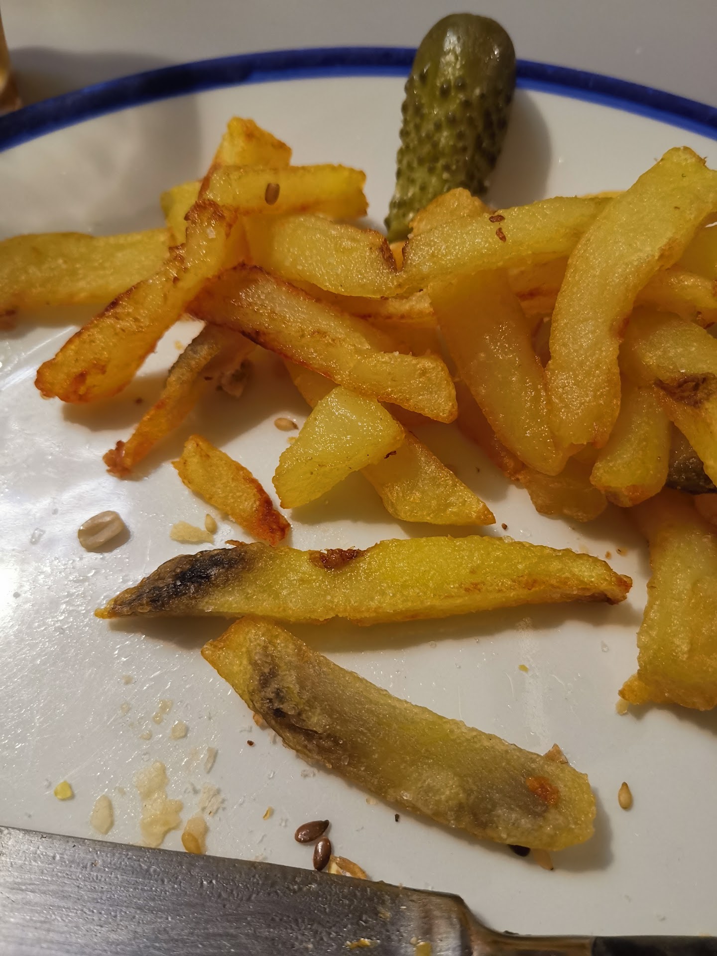 Nos llegaron los segundos, entrecot y hamburguesa, la hamburguesa sin gracia alguna, al igual que los fingers, se intuía buen material, pero hecha sin gracia y faltaban ingredientes, el entrecot muy bueno, eso sí. Y aquí empieza un poco el "festival" del servicio, hacía ya un rato que no dejaban entrar más gente, me parece correcto por las horas que eran, pero también empezaron las prisas por cerrar y las respuestas que iban dando el personal que teníamos las mesas de fuera, pues cada vez era más toscas. El entrecot se sirve con una losa para terminar de hacerlo y como bien se me indicó al hacer el pedido, si se enfriaba que pidiera otro para poder comer la carne bien caliente. Como estábamos en la terraza, la losa se enfrió y me quedaba medio entrecot, así que pedí otra losa, cosa que no le debió parecer muy bien a quien se lo pedí, porque volvió con otra losa y literalmente la tiró a la mesa, pensé, bueno se le habrá resbalado, pero ya estábamos un poco moscas con la actitud del servicio. Al poco ya empezaron las quejas por todo, si una mesa pedía algo, mala cara, si alguien preguntaba si podía comer (por lo visto normalmente tiene la cocina abierta todo el día), también mala cara, con la respuesta "es que hoy no tendríamos que haber abierto" y poco a poco una comida agradable en familia, se convierte en "venga termina que nos vamos".