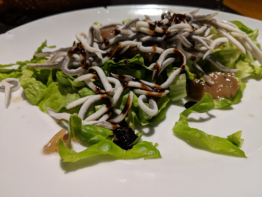 El menú lo encontramos algo más que discreto y nos sorprendió la opción de alubias con sacramentos en un menú de noche. Pedí la ensalada de setas y gulas que no sorprendió ni por sabor ni por presencia (hojas de lechuga cortadas en tiras interminables y dos setas contadas de bote). De segundo elegí txuleta con pimientos y patatas y se convirtió en una odisea cortarla y masticarla como un chicle.