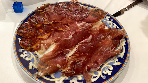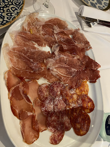 Elegimos uno de los menús especiales, para ser más exactos el número 2. Empezaré hablando de los entrantes, que ya fue el preludio de lo que vendría más tarde. Jamás, y digo JAMAS, he comido unos entrantes tan escasos. Para 4 personas; Dos langostinos pequeños por comensal. Un revuelto de gulas, las cuales estaban secas. Una ensalada, pequeña pero que fue lo más decente de toda la cena. Y como colofón final, el surtido de ibéricos se llevó la palma de los entrantes. Una rodaja y media de cada, finas como papel de fumar por comensal. Cuando digo una rodaja y media, hablo de forma literal, ni tres ni cuatro, UNA Y MEDIA!!!! De hecho, podrían haberlo sacado en un plato de postre y hubiese entrado sin problemas.