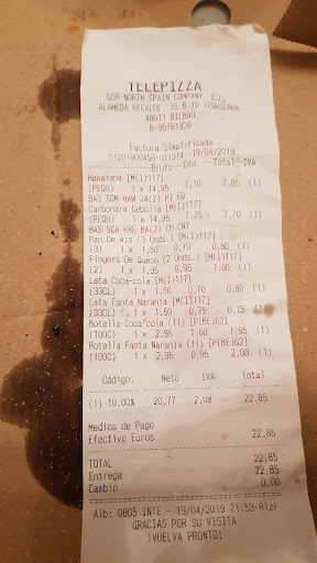 Les explico lo sucedido , a eso de las 18.45 he entrado en la app y he hecho un pedido, de tres pizzas medianas y un menú infantil, total 25.95 que debería recoger a las 19.55 en el Telepizza de Cruces ( Barakaldo ). Hemos llegado a la hora y nos comentan que no hay pedido, no se que problema habrá habido, pero a mí la app de mi banco me daba ok, revisen la aplicación por favor. Repito la operación, esta vez allí mismo, para las 20.25, y aviso del problema, muy de malos modos "me sacan del local" dándome una tarjeta y que llame por teléfono, para hacer el pedido. Aquí viene lo surrealista, les llamo desde fuera del local, y obviamente me dicen que no cogen más pedidos, a todo esto yo escuchando desde fuera, no cojas más pedidos , que si con 19 vale, que si 23 y hasta, que si me voy a la hora ( están en su derecho ) y que si esto y lo otro. Me dan las 20,30 h, y sin abandonar las inmediaciones del local, se me ocurre llamar a otro @telepizza_es de Barakaldo, concretamente el de Gernikako Arbola, y aunque inicialmente me toman el pedido, para llevarme a casa, me dicen que no me lo sirven, ya que me corresponde la @telepizza_es de Cruces, los que me han dado la tarjeta, para que les llame desde fuera del local, y deshacerme de mí...en fín, este viernes tenía pensado hacer otro encargo, ya que hoy no ha podido ser, pero como lo tengo que pedir a la de Cruces ( Barakaldo ) obligado y hoy me han hecho el "lío", pediremos otra cosa, a otro sitio. Gracias por su...