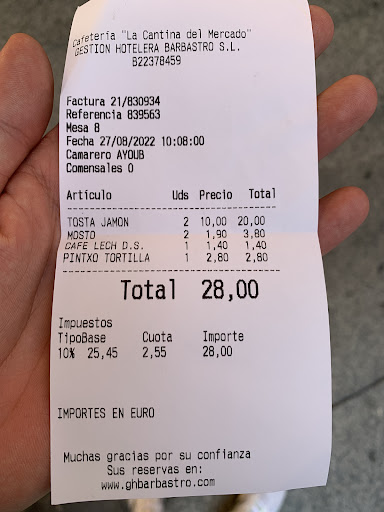 Read moreTe sientas a desayunar, no hay ni carta ni precios, pides 2 tostadas de jamón, un café, pincho de tortilla y 2 mostos. Te preguntan si el jamón lo quieres ibérico y decimos que si.Te llegan las tostadas de “jamon”, con tomate natural de bote, parece jamón de pegatina, no veo betas en el jamón y sospecho, lo probamos y de ibérico no tiene nada.Pedimos la cuenta y la foto lo dice todo, 28€ por el desayuno ????? Donde pone jamón ibérico en la cuenta??Pero donde estamos llegando??? Hace años que venía a desayunar aquí, pero acabáis de perder varios clientes.No estáis a la altura de cobrar esto por un desayuno dando la calidad que dais y ya que estáis podríais mejorar la atención del personal por lo que cobráis, que con 28€ me como dos menús del día en cualquier sitio de barbastro.Deberiais revisar los precios de este tipo de desayunos o revisar la calidad por que no está a la altura de lo que nos habéis cobrado.Me voy muy indignado, engañado y triste de encontrarme este tipo de situaciones cuando vengo a barbastro a pasar el día y apoyar el comercio.No nos volveremos a ver.No volveremos a vuestras instalaciones y no volveremos a probar vuestro producto...
