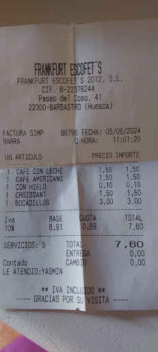 Atención llena de malos gestos y desinterés, pedimos un frankfurt normal y dos “frankfurts maxi”. Nos trajeron el normal y dos hamburguesas de vacuno prácticamente crudas, con pepinillos, cebolla cocida y tomate, por lo que reclamamos que el pedido era de frankfurts y no hamburguesas, el camarero de raza china nos atendió muy cortésmente y, ante el reclamo del pedido, regresó al restaurante (ocupábamos una mesa en una terraza enfrente). Al regresar nos dijo que el “frankfurt maxi” es… UNA HAMBURGUESA!!!. Ante la tomadura de pelo, decidimos no seguir con el reclamo, pagar y abandonar el pueblo que queríamos visitar, ya debido a la falta de confianza que inundó nuestra impresión. Lo único bueno fueron las cañas, pero es de esperar que esa calidad sea la misma en cualquier sitio. El precio: 35 € por todo, no lo juzgaría si la atención y el respeto hubiesen sido...