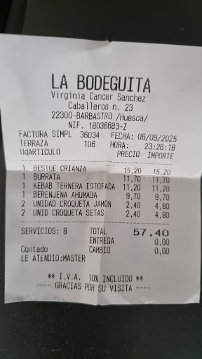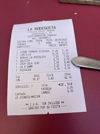 Read moreNada recomendable.....la ciudad de Barbastro ofrece otros sitios con calidad precio 10..... ínfima cantidad en los platos (4 mini trozos de costilla..10 €) súper súper picantes ..la carta no indicaba tal matiz .....por lo tanto y en definitiva el perjudicado es el cliente...pagas el plato si o si a pesar de no avisarte que es incomible por la gran cantidad de picante, consumes bebida de más para poder probar algo, pides pan para poder tragar y también te lo cobran a pesar de manifestar nuestro malestar por el fallo de la carta al no indicar el grado de picante.....en fin.... Nos hemos ido sin comer, ni disfrutar la comida...una pena...aunque la cuidad de Barbastro es súper bonita y su...
