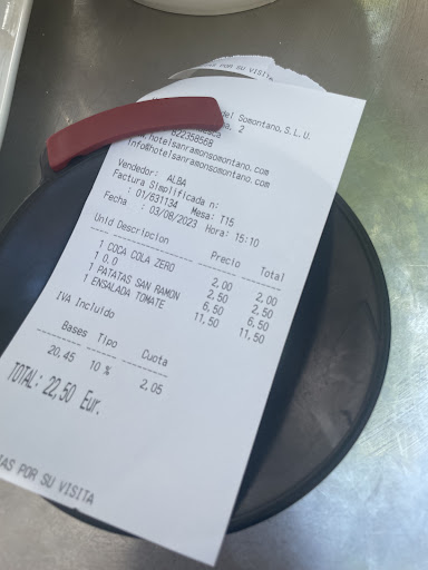 Read moreHemos ido a cenar un grupo de amigos alrededor de las 21:45 en la cafetería del Hotel San Ramón, servicio rápido de los camarer@s, no tanto el de la cocina, porque pedimos para compartir unas patatas bravas mientras traían los bocadillos y hamburguesas individuales que pedimos para cenar, tardando bastante las bravas en llegar, porque nos sirvieron incluso antes los bocadillos y hamburguesas que las patatas. Dentro de lo que pedimos como bocadillos, 2 comensales pidieron unos tacos de pollo con guacamole y ensalada, y ambos destacaron negativamente porque apenas había carne en ellos, en 4 taquitos que componían cada bocadillo. Resto de hamburguesas y bocadillos sí estaban perfectos. A pesar de la mala experiencia con los tacos, normalmente las raciones, bocadillos, hamburguesas que dan en la cafetería del Hotel San Ramón son de calidad y el trato agradable del servicio con...