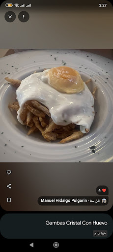 3️⃣ “Gambas de Cristal”. Uno de sus platos más icónicos. Una combinación de la fritura (muy rica, limpia y fina) junto al huevo, aunque estaba un pelin pasado, que hace que esté jugoso. Combinación muy deliciosa.