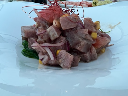 We arrived as the staff were setting up for the evening shift. It was no inconvenience to them. We politely sat in a corner spot, out from under their feet, and sipped drinks happily served to us, and watched the sunset from the fabulous vantage point of their upstairs terrace. The staff could not have been more accommodating and professional. We did go OTT on a tuna-fix (when in Rome), and tucked in as soon as we were served, hence a photo of an already "attacked" plate of food. We had the platter with samples of all (sashimi, picante, ceviche, tataki ) along with a complete dish of the picante and ceviche. Sooooo good, every single piece. Great background music, even if a crazy mix of old-time crooners to more modern rhythm and blues, it...