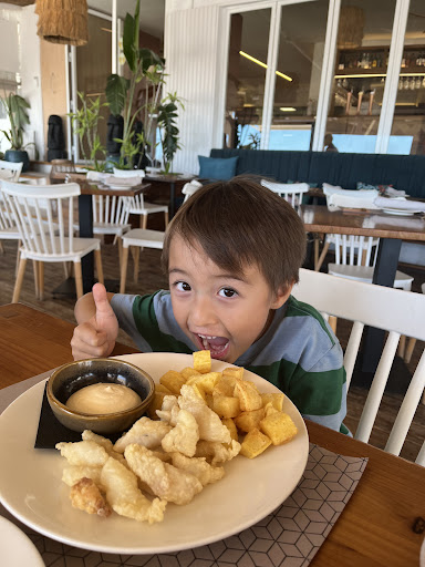 Gorgeous ambience for lunch. We were the first to arrive for an early lunch and they were very hospitable. Starting with the bread basket, two varieties of delicious bread. We ordered 1)Templada de pulpo y langostinos, cebolla dulce y mahonesa de soja 2)Tataki de atún rojo, salsa de jengibre, guacamole y piquilios 3)Cazuela de almejas, alcachofas y jamón ibérico, 4)Arroz negro con carabineros and 5)gallos fritos y patatas. The salad (1) was full of flavor but not overwhelmed by the tasty dressing. The tataki (2) was my fave, again very tasty and the red tuna was butter soft. The clams (3) came in a delicious sauce worth dipping the bread. And finally the paella, the rice was perfectly cooked and the carabineros so juicy! My 5 year old son had the “fish and chips” with a side of aioli. Great dish for kids, the breading was tempura-like, very light and the fish was very good quality. The food was all very good and the service was very attentive. I highly recommend!...