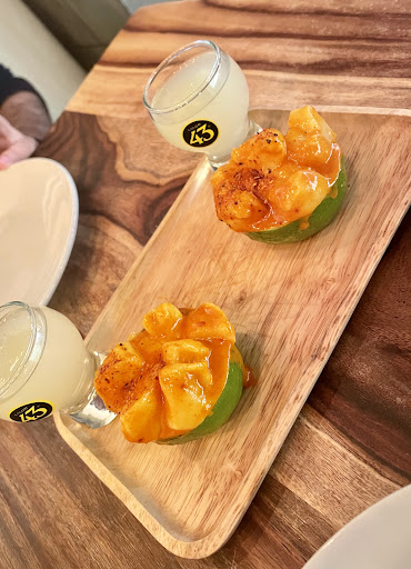 En particular, el callo de hacha fue uno de los platos más impresionantes que he probado. La vieira estaba perfectamente cocida y se asentaba sobre una cama de lima fresca que añadía un toque refrescante. La salsa de chile le daba un toque picante, pero no demasiado abrumador, lo que lo hacía el equilibrio perfecto de sabores. Además, venían acompañadas con un chupito de margarita para suavizar el picante.