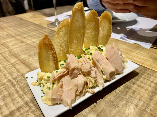 Para la ocasión, pedimos 8 platos más un par de postres para compartir: Ensaladilla rusa, salmón, steak tartar, patatas bravas, pulpo, vieiras, croquetas de jamón ibérico, presa de ternera, copa dalky y cheesecake. Para los amantes de la copa Dalky (Danone) es IMPRESCINDIBLE seleccionar este postre.