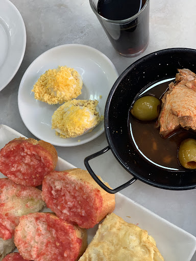 Comimos: ensaladilla de “cangrejo” que era básicamente surimi y huevo todo ultra picado con batidora y acompañado de 6 palitos de pan. He leído algunas reseñas alabando la ensaladilla y eso me da que pensar en que la gente en general come mal y tiene el gusto regular. croquetas de cocido y de bacalao que, CLARAMENTE, estaban recalentadas en el microondas, el rebozado no crujía nada de nada. A ver éramos 4 personas del País Vasco y de croquetas de calidad sabemos 🥹 Huevos rellenos: unos simples huevos cocidos con un poco de atún dentro y mayonesa por encima, ni estaban rebozados ni nada de nada. Un plato que gritaba “desgana”. pulpo a la gallega: tieso, sin patatas y sin gracia. Un gallego te lo tira a la cara. Bombas: recalentadas y sosas. Una masa de patata con nano presencia de carne. Triste. Albóndigas: lo mejor de todo lo que comimos y tampoco eran para echar cohetes. Estaban bien y la salsa rica. el pan con tomate: ¿De verdad no podéis pillar un buen payés y dejar unos tomaticos y un ajo para, al menos, ofrecer un buen acompañamiento? en lugar de eso recibes unos paupérrimos trozos de baguette ya untado y chorreando 🥲🥲🥲🥲