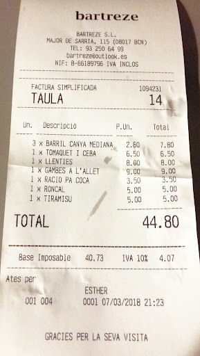 Read moreWe just arrived in Barcelona it was 11pm and we were staying in a hostel close by. After looking for suggestions on Google maps. I found Bar Treze was 3min walking distance from our place. We went there without any expectations but to have some drinks and tapas after a long road trip from Bilbao. We were warmly welcomed by the barman and we asked if there was still some food to eat. He brought us a tortilla and una ensalada de pulpo which was very good and finished by a plate of cheese perfectly matching our glasses of red wine. The atmosphere was cozy and the place is nicely decorated. We were very happy to have found this...