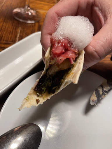 Now to las comidas, I started with the pastry of leek with foie gras. This was one of the best bites I’ve ever eaten, and I’d fly to Barcelona just to eat it. Photo below. Next, they offered me a chance to just have one unit each of the taco and the fricando sandwich. I have photographed the taco, but was too excited for the fricando sandwich to remember to take a photo. Finally, the suckling pig which was a daily special. The crispy ness of the skin is EXACTLY as you dreamt it would be, and the sweetness of the apple and sauce cuts through the richness perfectly. I left a small amount and had no room for dessert.