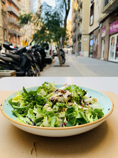 Great location and great service! Was impressed by the flexibility and personal attention from chef and staff. As a vegetarian who detests meat substitutes and products, especially in veggie burgers, I asked to send back the vegetarian burger I ordered as it both looked and tasted like meat. (Which is what people want often of course) . This was done without hesitation and with a smile. I changed to some tapas / starters of pan con tomate and the mushroom croquetas, which were really delicious!! I also had the goats cheese salad and asked for for cheese to be warmed some more and again, this was done swiftly and with totally courtesy and gentleness. No making the customer feel bad for requests, at all. Thereโs a terrace from which you can see the peaks of Sagrada Familiaโs towers, between the trees which actually makes for a lovely view. Menu is just one page-but thereโs something for...