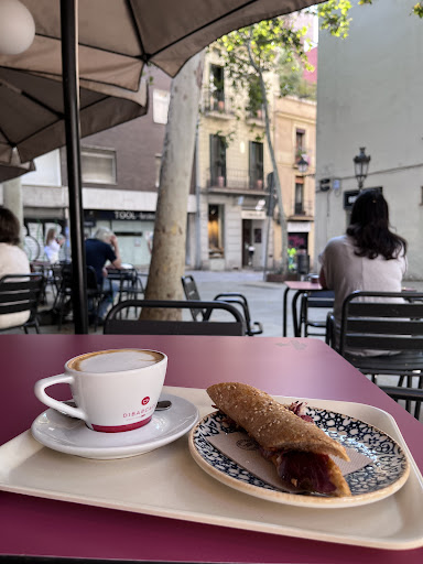 Finally stopped in for a light breakfast after passing by numerous times. The outdoor seating is inviting with umbrellas and on a quiet pedestrian street (except service trucks). You order inside from the ready-made food case which consists of the usual croissants and bocadillos. Per usual, you pay when you order, receive your items on a tray and find a table. The cafe con leche was good and the iberico bocadillo was really tasty. The two things cost €5.55. There was a lady (possibly the owner) making sure the ladies behind the counter took my order and cleaned a table for me when she saw there was no clean table (needed to be bussed). I appreciate the service and attention. Highly recommend...