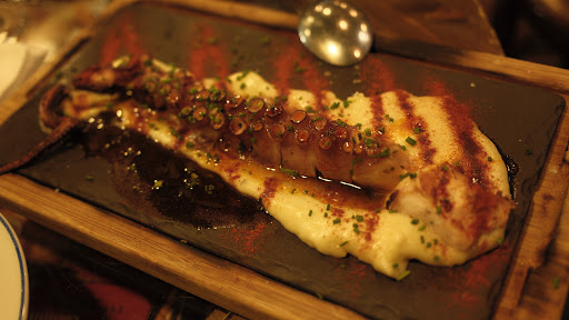 We ordered the meat tablet, the Manchego cheese tablet, had bread with tomato, then the pimientos de padron (fried green peppers), their patatas bravas, and two orders of their Bombas. It was all delicious and the portions were a great size for sharing between 4 people. Along with the bottle of wine for three of us, my husband and his son had a few large beers. For all that, it was a great price, especially considering that we got a nicer bottle of wine. My only constructive criticism is that the bravas came out really fast and we would have preferred if they had brought the meat and cheese first and taken more time bringing out the dishes. When we got the check, our server offered us 'chupitos' (shots of liquor) on the house and we chose the crema de orujo which is really nice. It's great to see places still doing that because it's a typical Spanish tradition but is not done as much as it used to be.
