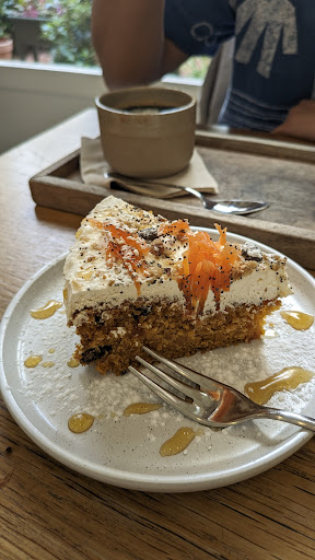 Aside from that, the Hummus plate had creative ingredients and full of flavor, the tempeh poke bowl was seasoned perfectly, (with ginger soy sauce?) and the Katsu Burger was a little hard but still delicious. Carrot cake frosting was a little too sweet for me but we enjoyed the cake.