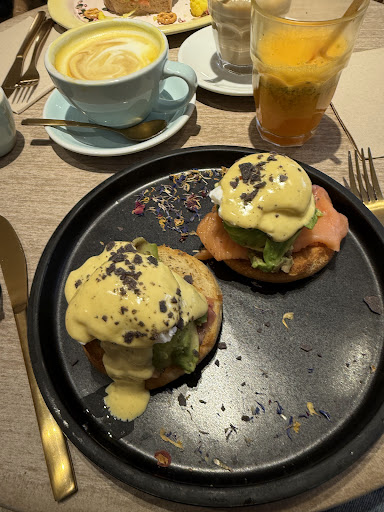 We had a delicious avocado toast (fresh, creamy, beautifully served), and the eggs Benedict with salmon and truffle — though we honestly didn’t taste much truffle, it was still rich and satisfying.