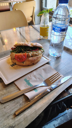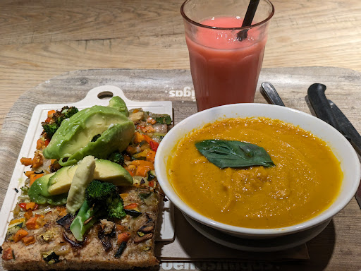 This is an amazing cafe in central Barcelona. Great selection of food and drinks - we are vegan and there were plenty of options for us. I had the vegetable focaccia with extra avocado on top with the carrot soup and a vegan milk berry smoothie. Love the atmosphere - it was buzzing with customers, once you order and pay at the till you go to the serving section and when your food arrives you take it on a tray to the table of your choice. Variety of different seating options. Staff were super helpful and spoke English, as I struggled at first to work out which options were vegan. However, there are many symbols with each dish one of which is the vegan V symbol. If you can visit this cafe / bar ,- you will not be...