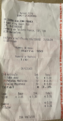 Absolutely horrifying experience. The place is filthy (bathrooms, sticky floors, trash on the tables and worst of all: kitchen area is a mess). Made the terrible mistake of ordering a medium fries. Wait time was 18 minutes in which nobody in the place got their order as seen by the numbers on the screen). Wasn’t exactly surprised that when the fries were finally ready and I took a bite, they were cold. Made the woman at the counter aware of this. She took the fries wordlessly and dumped them back into the warmer next to the fryer. Mind you, I had already touched them. No hygiene protocol whatsoever. They mixed them with fresh ones (well, as fresh as can be expected for that place) and wanted to return them to me. At that point, my desire to have anything from this establishment was null and I asked for a refund. The manager (?) printed out a “duplicado”of the bill and told me it would take a couple of days for the amount to be deposited into my account. It’s been one week and nothing. Is the loss of € 3,35 the end of the world? No. But the absolutely disgusting attitude of the staff in general is beyond bad. No professionalism whatsoever. Burger King, do better! Stay away from this place. You are better served to visit the neighboring bars. Better service, little wait time and about...