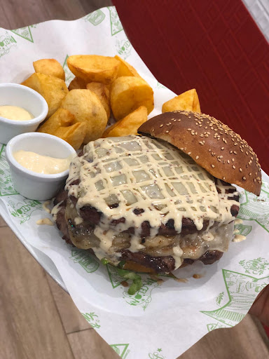 Read moreVariedad de hamburguesas tanto de carne halal, salmón o incluso vegetarianas en una decoración Made in US.
