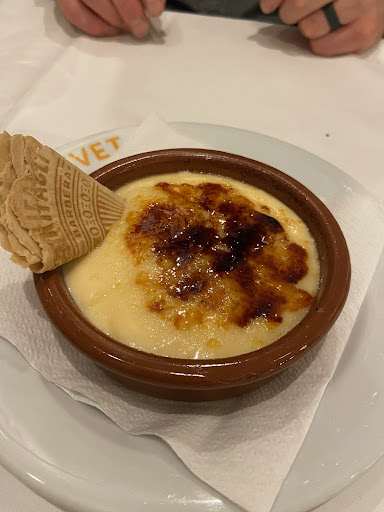 De postre, a destacar el flan de huevo de elaboración propia, consistente y con sabor a buena materia prima (huevo de granja), al que le hubiera sentado de maravilla un chorrito de ron cremat, para darle más identidad catalana al postre. Otra opción de postre made in Catalunya: el tradicional mel i mató. A destacar el ambiente cultural y bohemio, el trato profesional y la cocina tradicional catalana. Así que muy recomendable para degustar platos de la cocina catalana y practicar la inmersión cultural y culinaria. También para quien da mucha importancia a los cubiertos relucientes y servilletas y manteles de blanco impoluto.