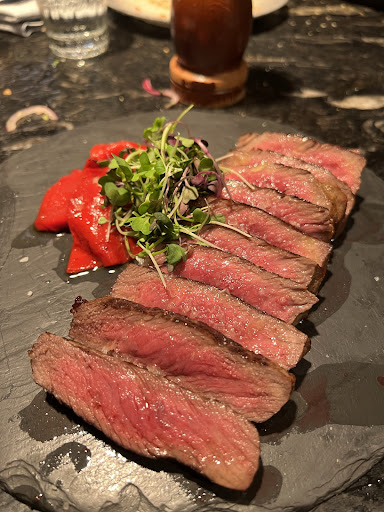 Another highlight was the truffle risotto, which my companion loved for its rich truffle flavor and smooth orzo. Although not to my personal taste, I appreciated the savory notes it offered. The mini matured beef burger with chipotle and caramelized onions was another hit, satisfying and delicious. A couple of the tapas fell short of expectations. The brie cheese, roasted apple, sundried tomato, and basil were served on toasted bread. However, the roasted apple was a compote that was smeared too thickly on the bread. It resulted in making the toast soggy and overpowering the advertised trio of flavors. We both scraped off the applesauce, but the damage was already done, so we simply skewered a small piece of brie with the tomato and basil for one bite, and abandoned the soggy bread. The other disappointing tapa was the portobello with smoked prawns and aioli. Again, the topping made the toasted bread soggy. We again just forked the smoked prawn and portobello and abandoned the soggy toast. Although a couple of the tapas dishes disappointed us, overall, we enjoyed a pleasant dining experience.