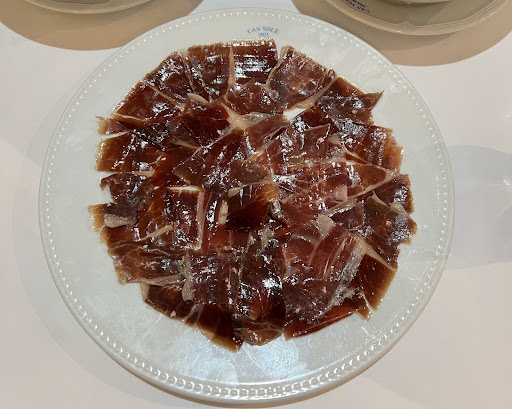 But it was the glistening plate of Iberico jamon (25.50€) that elicited ohhs and ahhs across the table. Shaved carefully and thinly, the ham was wonderfully sweet and “clean” tasting compared to Canadian counterparts. Our server suggested we get an order of the tomato bread (2.50€ per two slices) to go with it: thick pieces of well toasted (some a bit over done) country bread accompanied with raw garlic cloves and halved tomatoes to rub and smash to your heart’s content.