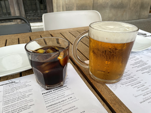 We came across this restaurant while strolling the streets of Barcelona. We weren't able to find any tables at the other restaurants we walked past so when we saw there was a table here we decided to stay. We ordered the "Surtido de Tapas" which was an assortment of 4 different tapas-fried calamari (squid), potatoes with aioli type sauce, seasoned pork bites and garlic mushrooms. The calamari was just OK. It wasn't hot like I prefer my calamari to be (it wasn't cold, just not as hot as I prefer). The potatoes were good with a tasty aioli type sauce, the mushrooms were my favorite (very hot and seasoned perfectly!) and the pork was seasoned superbly. We also ordered tomato bread and the waiter put in 2 orders without asking if we wanted 1 order or 2. We were not able to finish 2 orders. We sat outside and loved watching all the people walk by on the street. The waiter wasn't overly attentive to us and we had to ask for our check twice. It seemed like he had too many tables he was responsible for. With tip we spent...