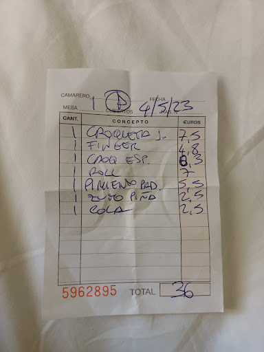 Serving tasteless, mushy Fingerfood, that might as well has been bought in Aldi and deep fried after, is one thing. When a customer says he is not satisfied, standing in front of him trying to teach the customer that he has no clue, is another thing. The Tapas are a joke, so is the behaviour of the people that serve the food. The prices are for the area absolutely not acceptable either. One street further you get very nice Empanadillas for 2.5€ a piece. Here you pay like (well the bill is attached) 5-7€ for deep fried mash.