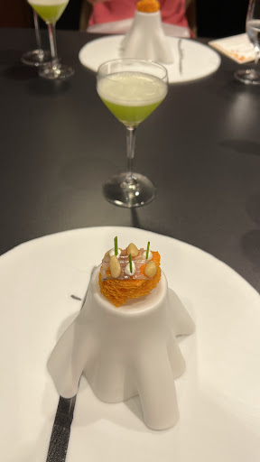 The experience began with the piparras and smoked anchovy bonbon, a deceptively overwhelming bite that revealed an explosion of salty, briny saltwater, evoking the pure essence of the sea, followed by a lingering heat from the pepper. What was immediately obvious was that the palate-awakening flavor, the vibrant presentation, and the stimulating, unique texture of the dish set the tone for the rest of the meal.