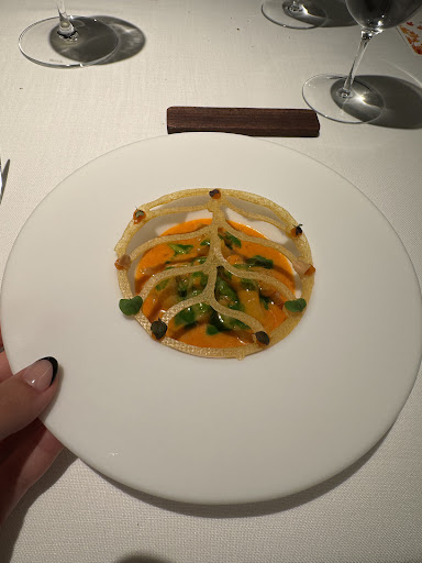 Another exceptional course was the Ruma Gallega pit with Iberian ham Fisan, delivering smoky, earthy notes that balanced richness with depth. The "cured squid" provided a delicate contrast with its unique cheese-like texture—smooth, almost creamy, yet still distinct and savory. This texture, paired with the caviar, created a perfect balance of flavors, where the briny pop of the caviar enhanced the richness of the squid and elevated the overall dish to something truly special. The visual appeal of the dish, with its clean lines and minimalistic elegance, reflected the harmony of its taste.