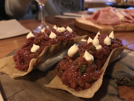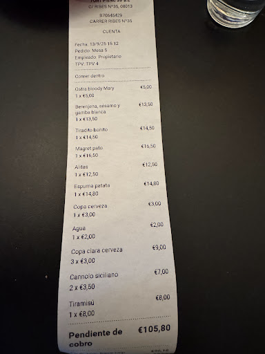 My husband and I stumbled upon this place after a tour of La Sagrada Familia, which is a short distance from the Bar. The neighborhood was full of locals walking, playing football, shopping… Catalonian daily life on full display. We arrived about an hour early for our 8:00 pm reservation (typical Americans) and were greeted by the owner and his wife, an Italian couple with culinary roots all over Europe. We were quickly whisked to an out-door table for two facing the promenade-the next two hours was one of the top three culinary experiences of our lives. (And we have dined at three star Michelin) A crisp local white wine accompanied plate after plate of intense and astonishing flavors. Steak tartare with olive oil, with a hint of heat from a Serrano pepper was a revelation. A squash blossom filled with salted cod and lightly deep fried was so good it left my husband speechless, which is not an easy task. Our waiter and the sous chef , a recent transplant from Paris, also provided color and detail as we worked our way through the menu. Locally sourced, the menu changes with the product available. The wines are organic and beautifully curated and ridiculously inexpensive. In fact, the quality of the food, the attention to detail on presentation, and the knowledge, skill, and hospitality make this an absolute must destination. We have reservations at a three star Michelin in Girona, but we have already made reservation to return to Contracorrent Bar upon our return to Barcelona. I wonder if El Celler can Roca...