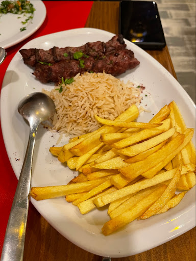 We got tabuleh which was mostly parsley with onion, tomato, lemon, pomegranate seeds and had a sour taste from the lemon. We also got a kebab plate which turned out to be less than what the photo on the menu looked like, in the photo there was a pita bread included for example. The kebab plate was two pieces of meat with rice and French fries, somehow costing almost €15. The kebab was a bit dry and did not have a lot of flavor. If you’ve been in nyc, you can find street food carts that give better flavored and larger portioned kebab dishes for 10 bucks. Lastly we had black and green tea, which they give with sugar and you can order it with milk, lemon, mint, etc, it was not bad.