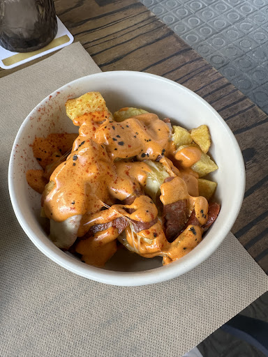 The potatoes with sausage and cheese were the standout for me. The potato cubes arrive crisp on the outside and fluffy inside, generously topped with slices of sausage (chorizo-style) and a creamy, smoky cheese/sauce. The combination of textures, crunchy potato, snappy sausage and gooey cheese, works really well, and the dish has a comforting, homey flavor without being heavy-handed. Perfect as a starter or to share.