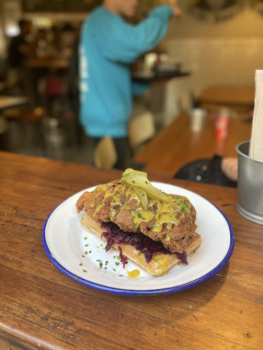 Read moreLocated in Raval - 5 mins walking from MACBA . 🇬🇧🔎Cool and funky interior design, a good place for gatherings, besides their main fried chickens, they serve Tapas as well . 🍗In search of the best Fried chicken and waffles in Barcelona, I had to try this one as well. They have it with honey mustard sauce and cabbage, which I tried, and also with blue cheese and provolone sauce. I still prefer the classic which is with maple syrup. The fried chicken burger was good, I loved the bun, which is apparantly is being made daily by their order The chicken Fritos was tender and comes with 5 different handmade sauce which was a bless :) . 🗣️ The food served on time and service was good . 🇪🇸🔎Diseño interior fresco y moderno, un buen lugar para reuniones, además de sus principales pollos fritos, también sirven tapas . 🍗En busca del mejor pollo frito y gofres de Barcelona, tuve que probar este también. Lo tienen con salsa de miel y mostaza y repollo, que probé, y también con queso azul y salsa de provolone.Todavía prefiero el clásico que es con jarabe de arce. La hamburguesa de pollo frito estaba buena, me encantó el pan, que aparentemente se está haciendo todos los días por su orden El pollo Fritos estaba tierno y viene con 5 diferentes salsas hechas a mano que fue una bendición :) . 🗣️La comida servida a tiempo y el...