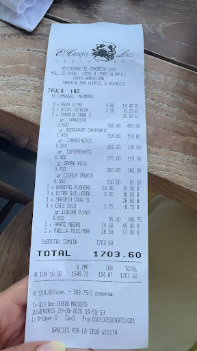 Sens dubte és un restaurant ideal per a qualsevol ocasió, esdeveniment celebració o àpat, tant per la cuina excepcional que ofereixen com pel lloc privilegiat on està situat. Aneu-hi en parella, amb la família, amb amics, companys de feina, amb qui vulgueu i gaudiu d’aquest restaurant. La relació qualitat-preu és bona tenint en compte l’altíssim nivell gastronòmic i l'excel·lent producte que ofereix. Moltes felicitats, llarga vida al Cangrejo Loco i enhorabona a tot l'equip!!!