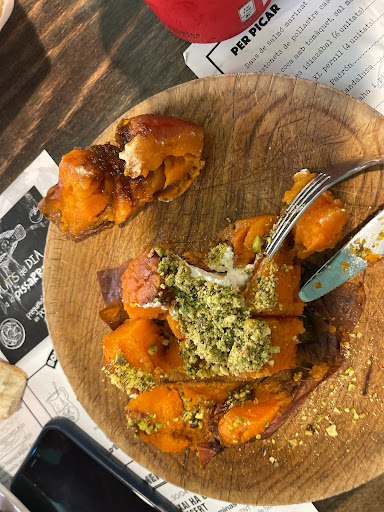 Read moreUn restaurante imperdible de Poblenou. El restaurante de la sala Beckett es ideal para tomar una caña y unas chips de churrería antes de cualquier de las obras que tienen en cartelera, ya lo conocía antes de la situación de COVID. Ayer cené por primera vez, tienen una carta con muchas opciones ricas y platos del día. Probamos las bravas que son buenísimas, buñuelos de bacalao, croquetas de idiazabal buenísimas también y de rabo de toro, salmón ahumado y carpaccio con parmesano y un helado de mostaza brutal, pan de coca con tomate...muy sabroso todo. Probamos también la tartita de queso y el tiramisú casero que estaba realmente bueno de postre. El café también bueno. El local es precioso y amplio, con su toque industrial de las vigas, intenta mantener su origen, de hecho comunica con el antiguo colegio Pau i Justicia, que conserva su estructura (no entramos pero quizás si lo pides puedes pasar a verlo). Conserva un halo de las cafeterías de los teatros...creo que es un sitio ideal para reunirse, pero también para ir a escribir o leer. Nosotros fuimos con una perra y pudimos estar dentro con ella, punto súper a su favor. Ahora disponen de 3 mesitas fuera también, dogfriendly!. La atención muy amable y atenta de los camareros y camareras. El precio correcto para lo que comimos y bebimos, las tapas, dos botellas de vino postres y café, 21€...