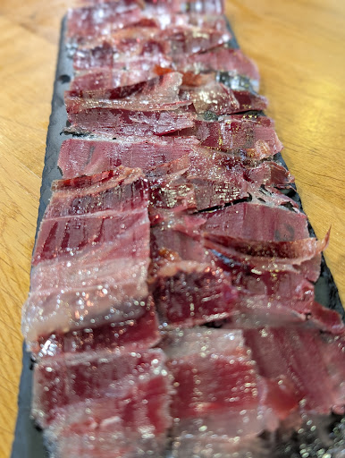 Desde que entras, te recibe una impresionante selección de jamón, embutidos y quesos provenientes de diversos rincones de la península. Puedes adquirirlos para llevar a casa o, si lo prefieres, disfrutarlos en el momento en el restaurante.