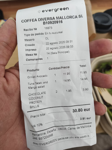 In April 2025, my wife and I were visiting Barcelona, Spain part of a two-month whirlwind tour of Europe from the U.S. We were headed to visit another famous Gaudi landmark, and on the way we stopped at Evergreen since we had some time to kill. Right off the bat, it has a friendly inviting outside and inside vibe. The host, whose name I forgot to obtain, greeted us with a smile and seated us promptly. I had the chicken wrap and my wife ate the beef Kofta Kebab, which is also pictured among the other reviews here, and both meals were very good. Our host and the staff were cordial and friendly [and spoke English] since we are from America that was a plus. I also had a passion fruit juice that was delicious, suffice it to say that the food is fresh, well presented, and very good; a little high on the menu prices due to its Beverly Hills-like location, but worth the visit. In addition, they cater to breastfeeding mothers, and apparently to little well-trained dogs. Our host explained that the restaurant is owned by a Ukrainian woman and that they have been open only for 7 months, talk about doing it right the first time right out the gate! The vibe inside is open, friendly, inviting, and appealing, with original photos on the wall, and very interesting live moss adorning both the walls and under the main counter as an attractive display; the restaurant is adorned beautifully. The owner has exquisite taste in both décor, her food menu, and her staff. My impression? A must-try for...