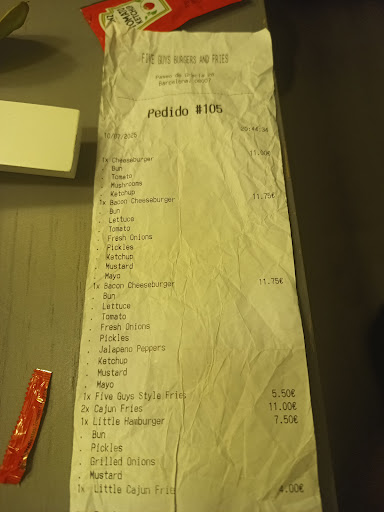 Read moreRecently visited the Five Guys location on Passeig de Gràcia, and while the food was pretty good, the real highlight was the exceptional service from the cashier. From the moment I walked in, he greeted me with a warm smile and made sure I felt welcome. Throughout the ordering process, he was attentive, patient, and knowledgeable about the menu, answering all my questions with ease in English.
