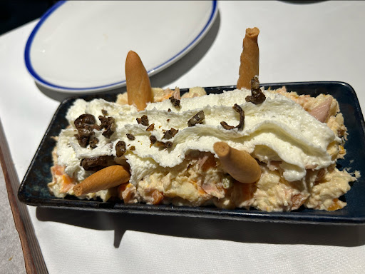 Read moreElegant restaurant with many tables and modern decoration. It is well located and has a very pleasant atmosphere. I've been here twice, once for lunch (menú del día) and once for dinner (a la carta). They offer a daily menu (only at lunchtime and I believe weekends excluded) for 13'95€ which is totally worth it (you get two dishes, dessert and bread + drink). We ordered the fussili and the salomorejo, the chicken and the sponge cake with mango and pineapple. If you get the chance definitely order the fussili and the sponge cake as a dessert (and maybe skip the chicken, since it was a bit tasteless). 4/5 stars If you go at night they don't offer the daily menu, so you choose from all the dishes they have (which I found they didn't have a wide variety of dishes). The portions are rather small so with one main dish you might find it's not enough. Worth mentioning the starters/to share because they were delicious (we had the cod fritters, the ox-tail gyozas and the two types of croquettes). 3/5 stars Both times the service was rather slow despite the restaurant being half empty.